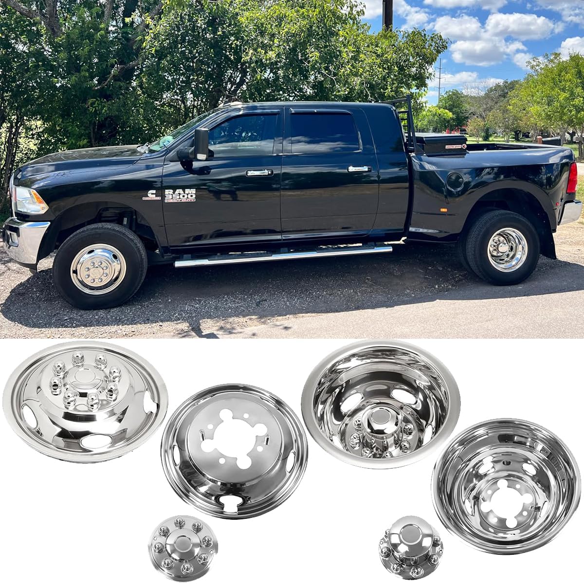 4pcs 17" Polished Stainless Steel Dually Wheel Simulators,Nice Looking Bolt On Wheel Cover with Removable Centre Cap,8 Lug 5 Hand Hole Hubcap Fit for 2003-2018 Dodge Ram 3500 17D8